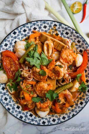 Optional, to add makrut lime leaves for even more fragrance. Tear or bruise the lime leaves before adding it in. Once the sauce starts boiling again, the dish is done.