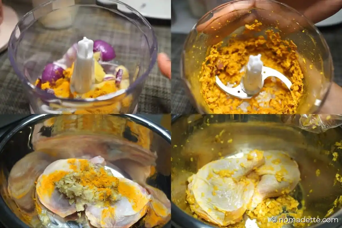 - Blend or process shallots, garlic, galangal, turmeric, salt, and sugar into a smooth paste. Rub this marinade onto the chicken pieces. For best flavour, marinate overnight, but you can cook immediately if short on time.