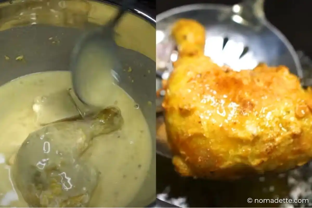- Dip each chicken piece into the batter, then carefully lower into hot oil. Fry until golden and crispy, about 4โ5 minutes. (The chicken is already cookedโweโre only crisping the exterior.)