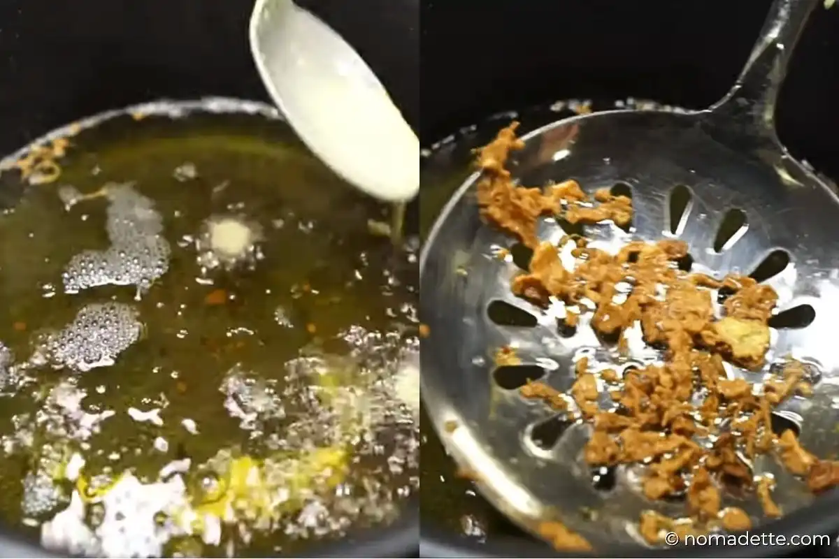 - Once golden and crisp (it will be quick!), remove and drain. These crunchy bits are sprinkled over the chicken when serving.