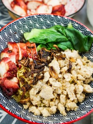 Traditionally, it features egg noodles tossed in a savoury sauce with minced pork, slices of pork, pork liver, fish balls, and sometimes mushrooms, topped with fried shallots. Since I don’t consume pork, I made a version with chicken – and am more than satisfied with how this turned out! The noodles are usually tossed with vinegar and chili for that signature tangy, slightly spicy flavor.