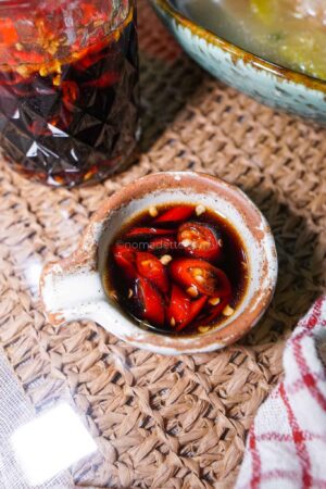 Whenever I have dinner at my friend’s place, her mother-in-law would always put out a small saucer of this Chinese Chilli Garlic Soy Sauce: a spicy, garlicky, herby soy sauce dip. It didn’t matter what was on the table — steamed fish, prawns, or chicken — that little saucer was non-negotiable.