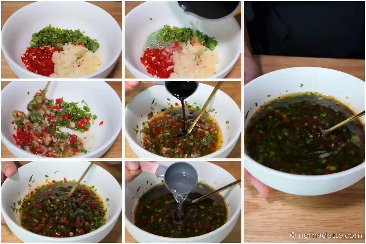 This particular recipe is a hot oil–based dipping sauce made with finely minced garlic, bird’s eye chillies and fresh coriander, finished with soy sauce AND fish sauce (extra umami!), balanced with sugar, and just a touch of sesame oil for fragrance.