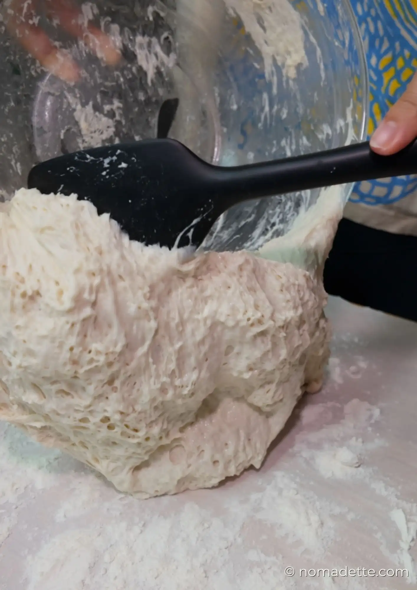 - Scrape the risen dough straight onto the prepared baking sheet.