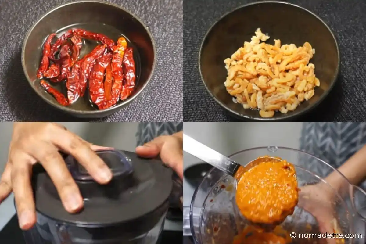 - To a blender, add the dried chillies, chopped onions, garlic, and the dried shrimps. Pour in the shrimp soaking water as well – this is full of umami flavour! Blend to a smooth paste. Add water bit by bit to blend easier, if needed.