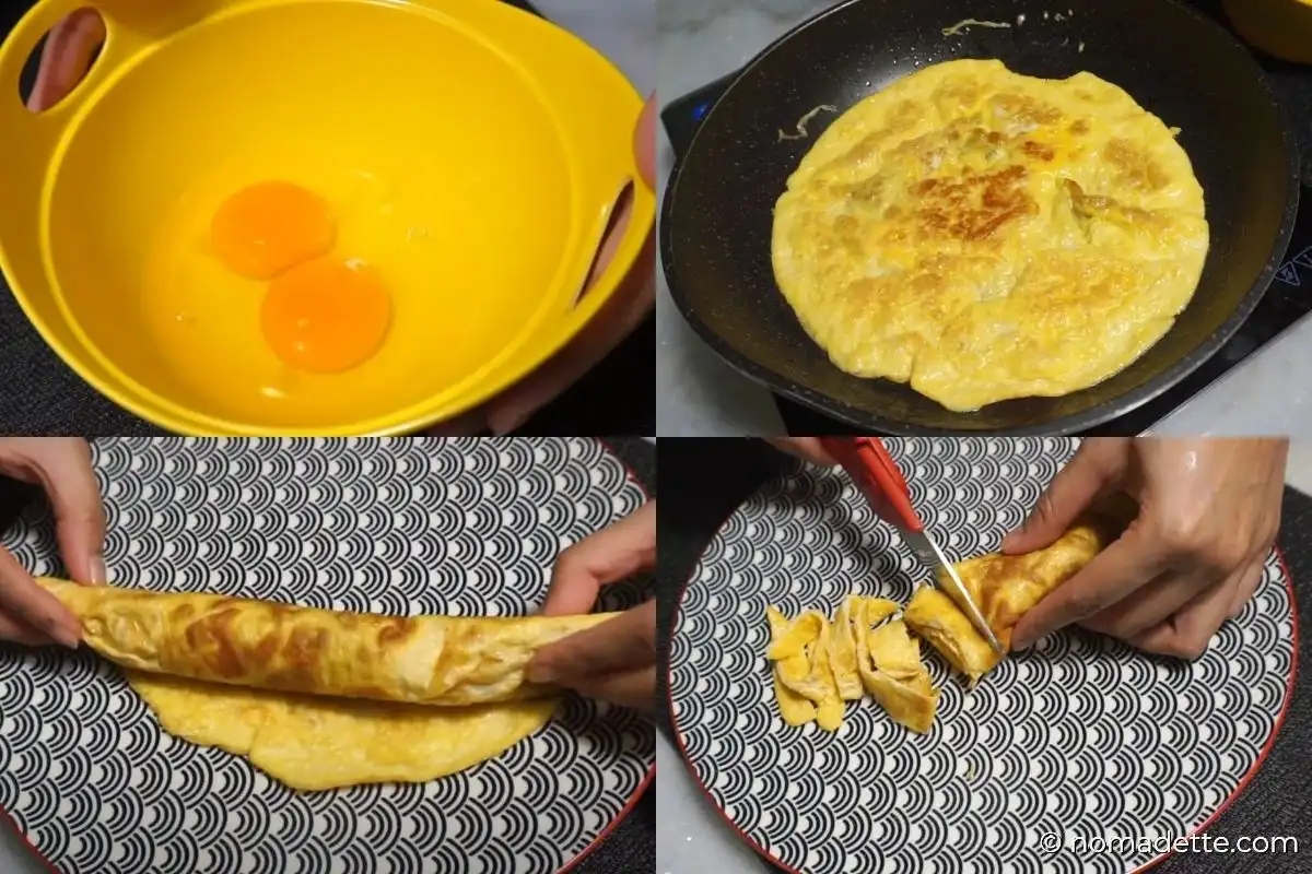 - Omelette strips or boiled eggs – for protein! It’s a classic garnish that makes the noodles feel complete. To make it, just cook a simple omelette (I usually season mine with a pinch of salt, but it’s optional). Once cooked, roll it up, slice into thin strips, and you’re done! Traditionally, the egg is prepared separately as a garnish, unlike Mee Goreng where it’s often fried together with the noodles. That said, you can skip the garnish step if you prefer.