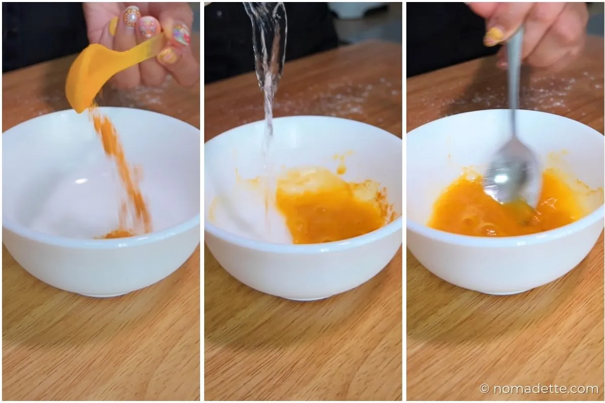 Optional: Dissolve turmeric powder in 1-2 tablespoons of water for a smoother batter and more even colour.