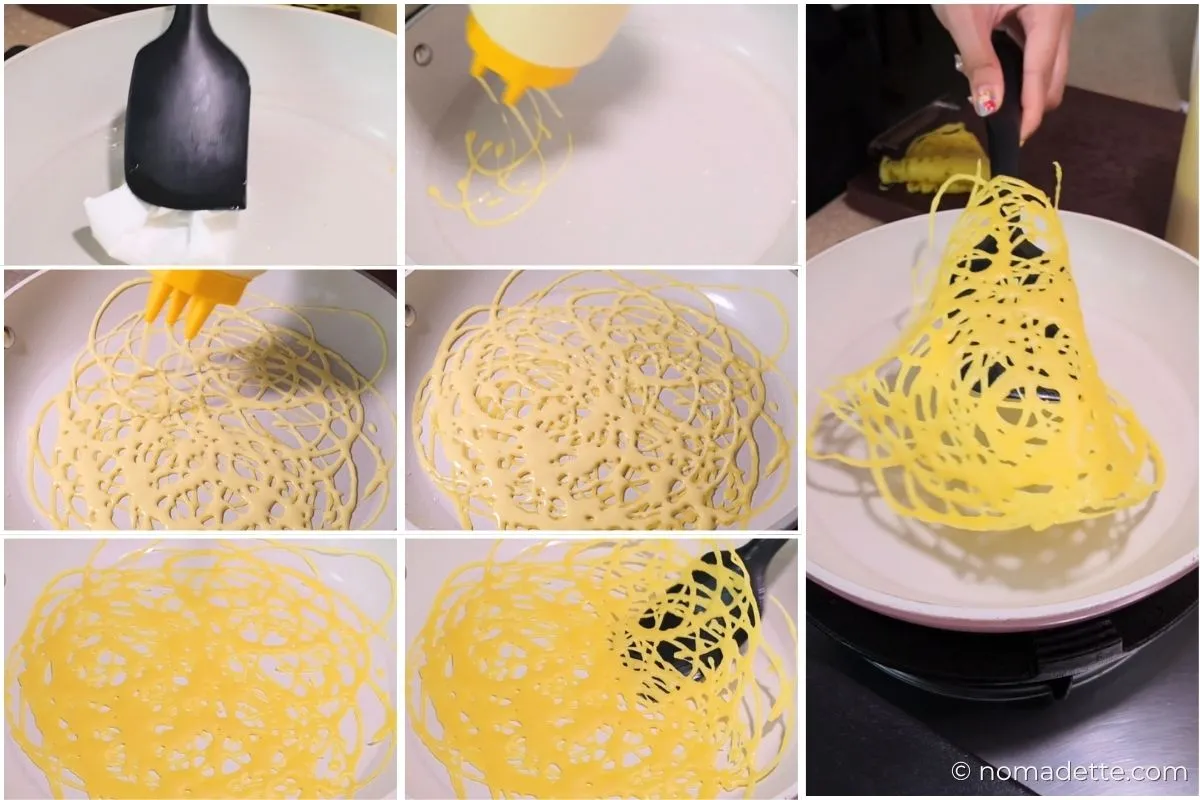 • Squeeze Bottle: Flip the bottle over the pan and gently squeeze to release the batter. Drizzle in a continuous circular motion.