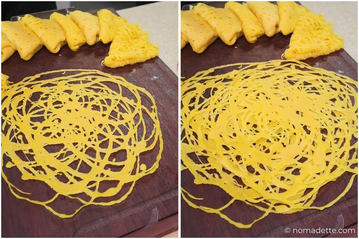 • NOTE: The batter should feel easy to work with. If it’s too thick, the lines won’t flow properly and you’ll lose that net-like structure. If it’s too thin, you’ll get faint, dotty splotches instead of defined strands. Adjust as needed with a little water to loosen, or a small amount of flour to thicken, until you get a steady, smooth drizzle.