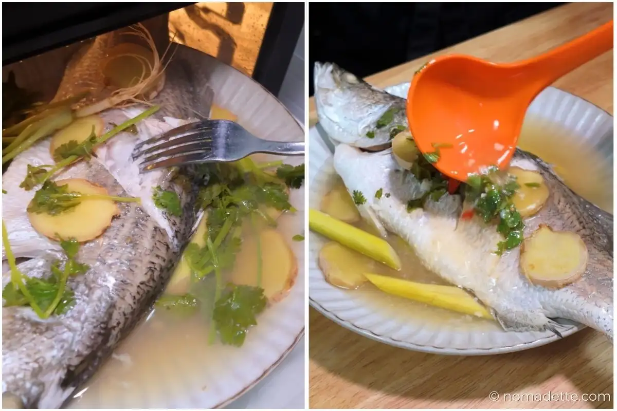- Pour the nam pla sauce over the fish. If there’s extra sauce, or it doesn’t fit neatly on the plate, serve it on the side.