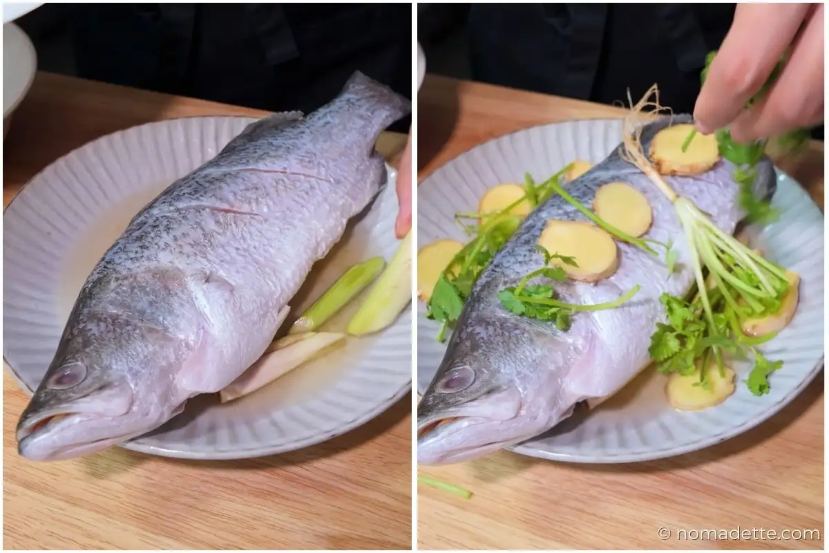 - Pour in about 2-3 tbsp water in a heat-proof plate or shallow steaming dish. Arrange ginger, lemongrass, and cilantro roots evenly in the dish, reserving a few pieces to place on top of the fish.